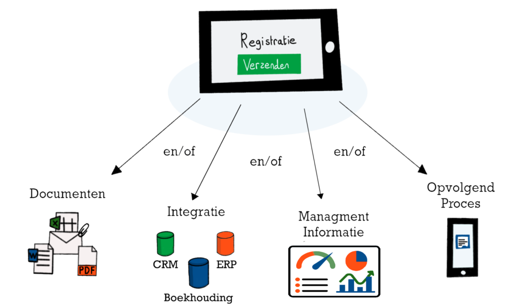 Een registratie met de werkbonapp kan resulteren in een mooie werkbon of rapport. Maar ook tegelijk resulteren in een registratie in een ander softwaresysteem. Voor managers kan de informatie terugkomen in hun managementdashboard. Of het kan erin resulteren dat er een opvolgende werkbon klaar wordt gezet voor een collega. Er is veel mogelijk.