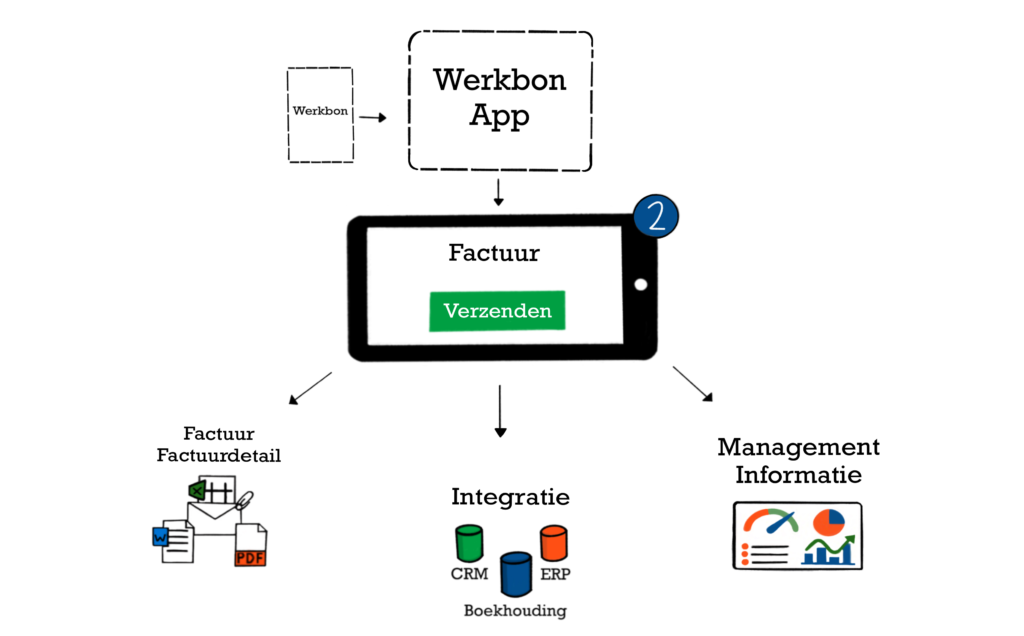 Een registratie met de werkbonapp kan resulteren in een mooie werkbon of rapport. Maar ook tegelijk resulteren in een registratie in een ander softwaresysteem. Voor managers kan de informatie terugkomen in hun managementdashboard. Of het kan erin resulteren dat er een opvolgende werkbon klaar wordt gezet voor een collega. Er is veel mogelijk.